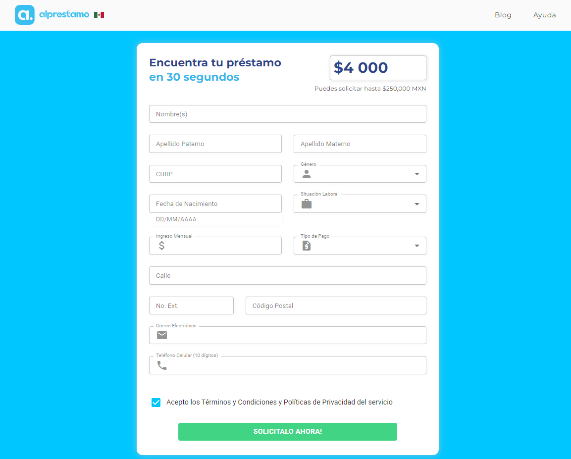 Dado que Alprestamo no ofrece a los ingresos propios, pide pocos requisitos a los potenciales clientes: nombre y apellidos, CURP (La Clave Única de Registro de Población), sexo, fecha de nacinamiento, situación laboral, ingresos mensuales, dirección domiciliaria, dirección del correo electrónico y número de teléfono móvil. Sin embargo, el cliente debe ser consciente de que el banco o la entidad financiera elegida por él puede preguntarle documentos adicionales.