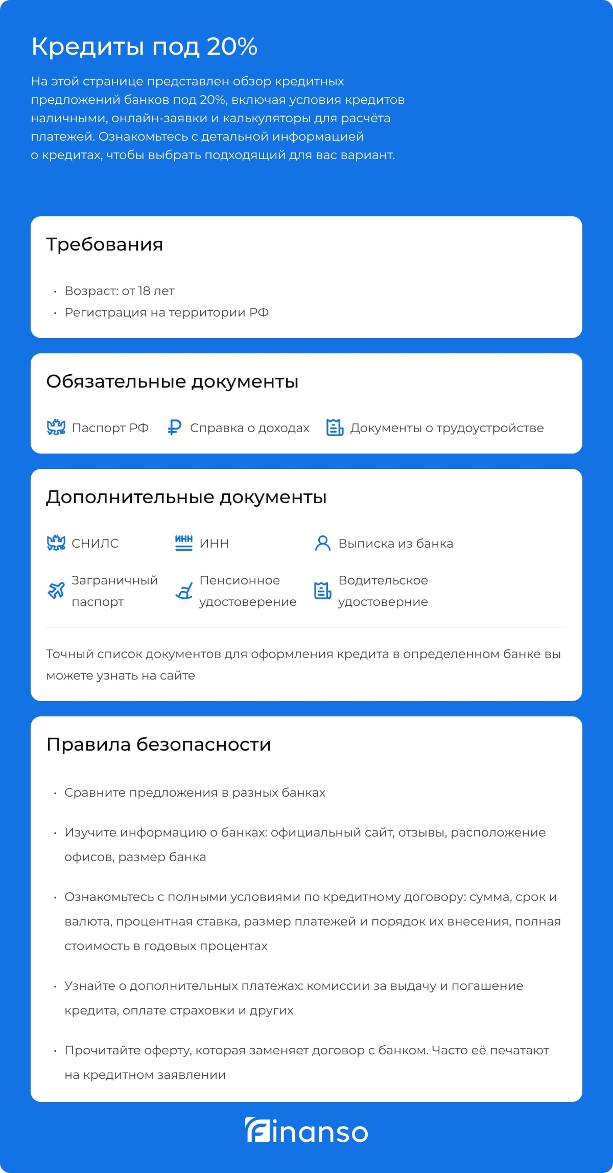 Кредит под 20% годовых можно оформить, если вы являетесь зарплатным клиентом банка или можете предоставить залог. Но важно сравнивать условия разных банков, учитывая не только процентную ставку, но и срок, сумму кредита, возможные дополнительные расходы и скрытую комиссию.