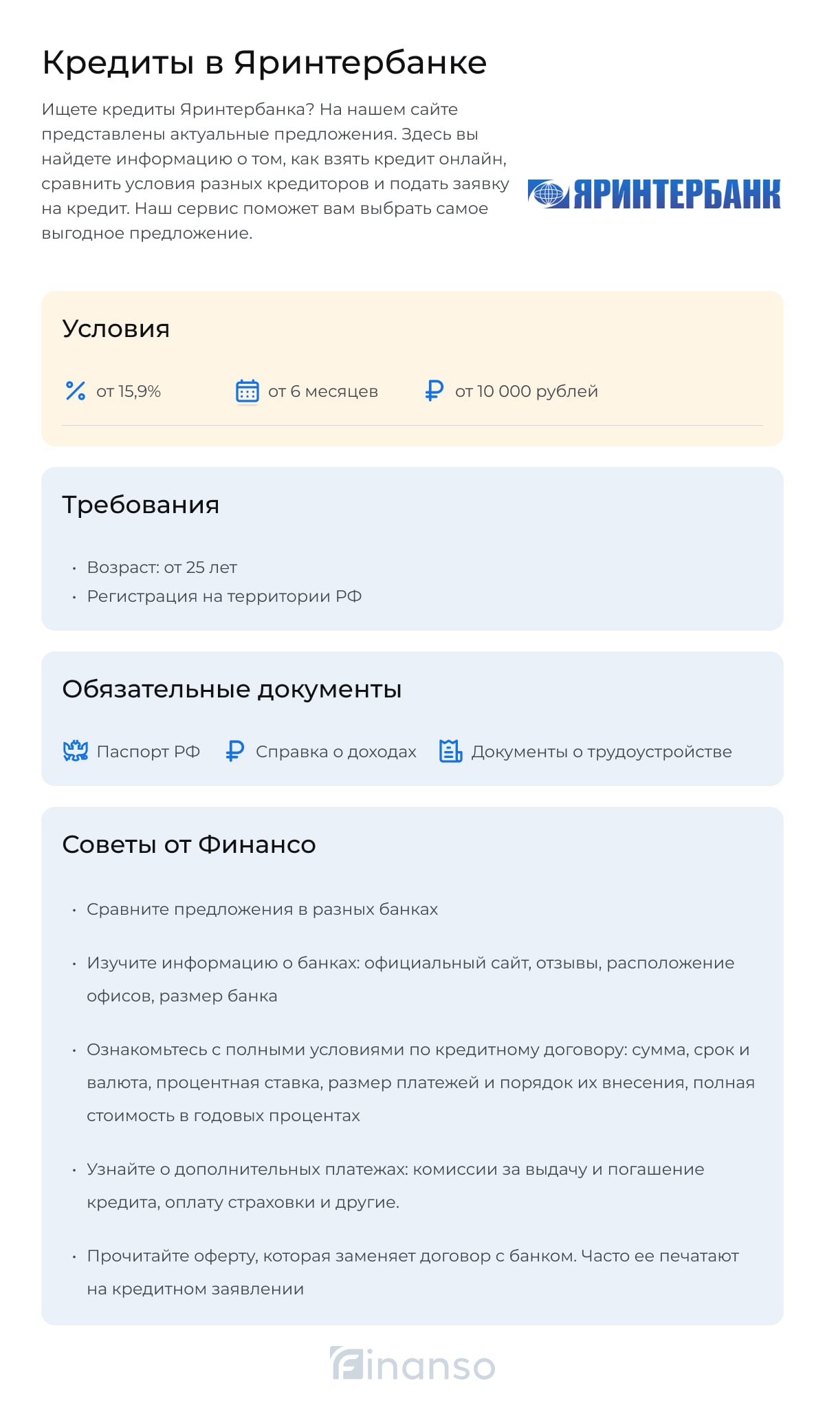 Яринтербанк - региональный банк с консервативным подходом в сфере кредитования, обеспечивает высокий уровень безопасности и надежности своих услуг. Особое внимание банк уделяет обслуживанию местного населения и участников зарплатных проектов, предлагая им льготные условия. Благодаря этому подходу Яринтербанк становится более доступным выбором для клиентов в своем регионе.